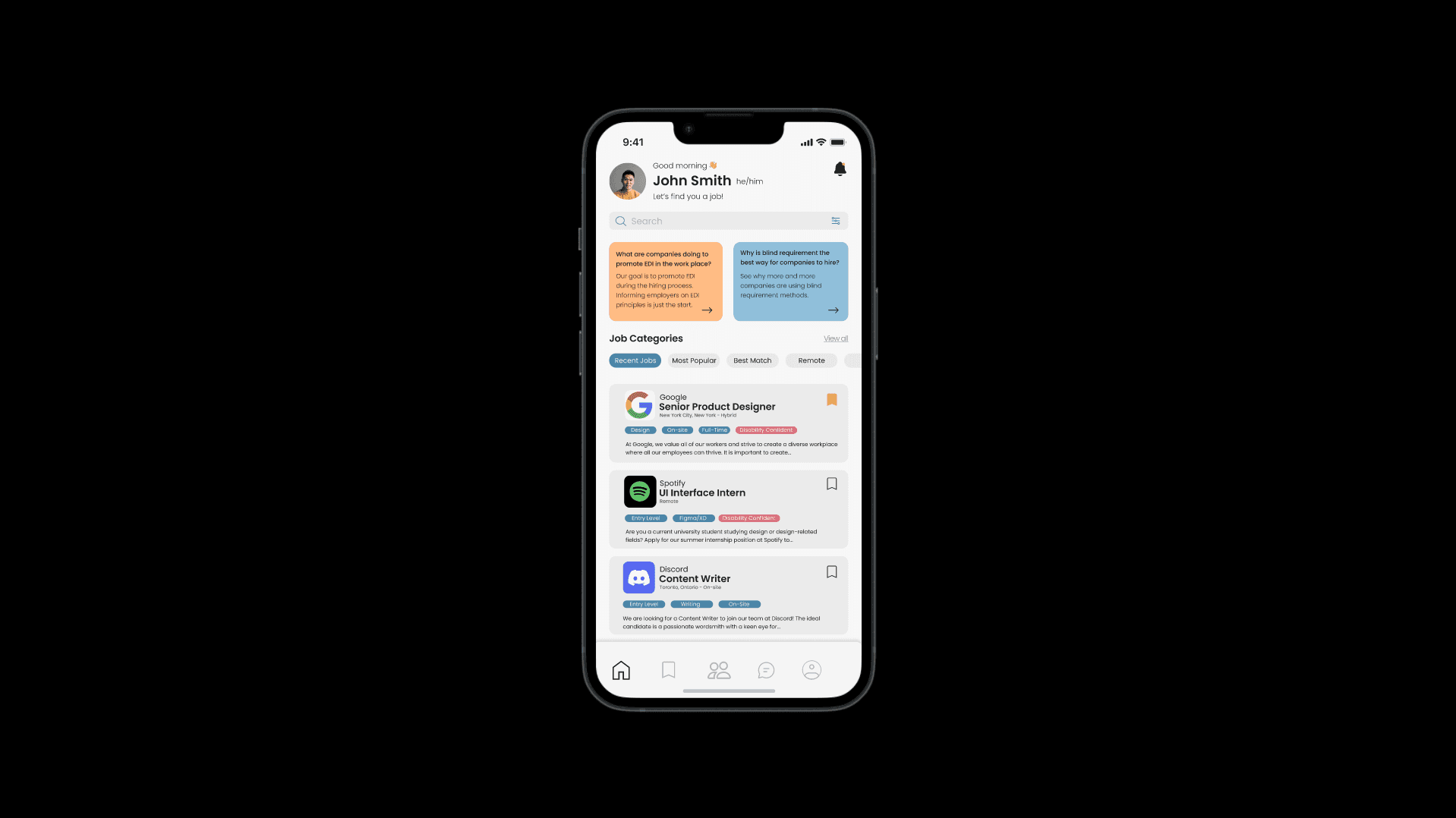 Navigation is one of the most important aspects of a mobile application as it is the central tool to help you find information that allows you to complete your current tasks. Having clear navigation allows for the flow of information to be concise, creating a better user experience. Our mobile application achieves this by creating and using universally recognized icons to symbolize their function and purpose to users, as well as filters to create better job-searching experiences. Open Door has original ideas that are accessible to all and promote inclusivity. The application uses features like the ‘Trending Topics’ section to promote EDI trends and allows users to learn what companies are doing to promote EDI in their workplace. Having this feature in an application designed for finding jobs allows companies to be rewarded for their great EDI practices. It navigates other people who are interested and well-versed in EDI to find these companies to potentially bring their skills to like-minded teams.